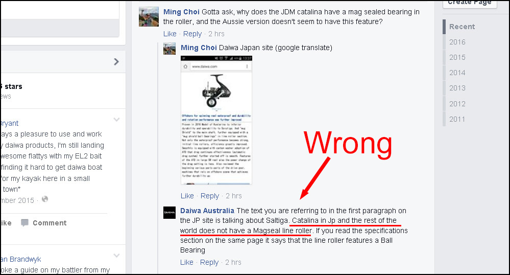 ![]() Daiwa Australia continues to put their legendary ignorance on display in ways that one can't begin to fathom, and as usual people swallow whatever they hear from the so-called "authoritative sources". They tell anglers that the 2016 Catalina has a rubber sealed line roller in Japan and worldwide, which would lead to disastrous problems if people lube them and ruin the magnetic fluid. In reality the 2016 Catalina has a mag-sealed ball bearing in the line roller, therefore the roller should only be rinsed with tap water after fishing and should not be lubed or sprayed with cleaners etc.