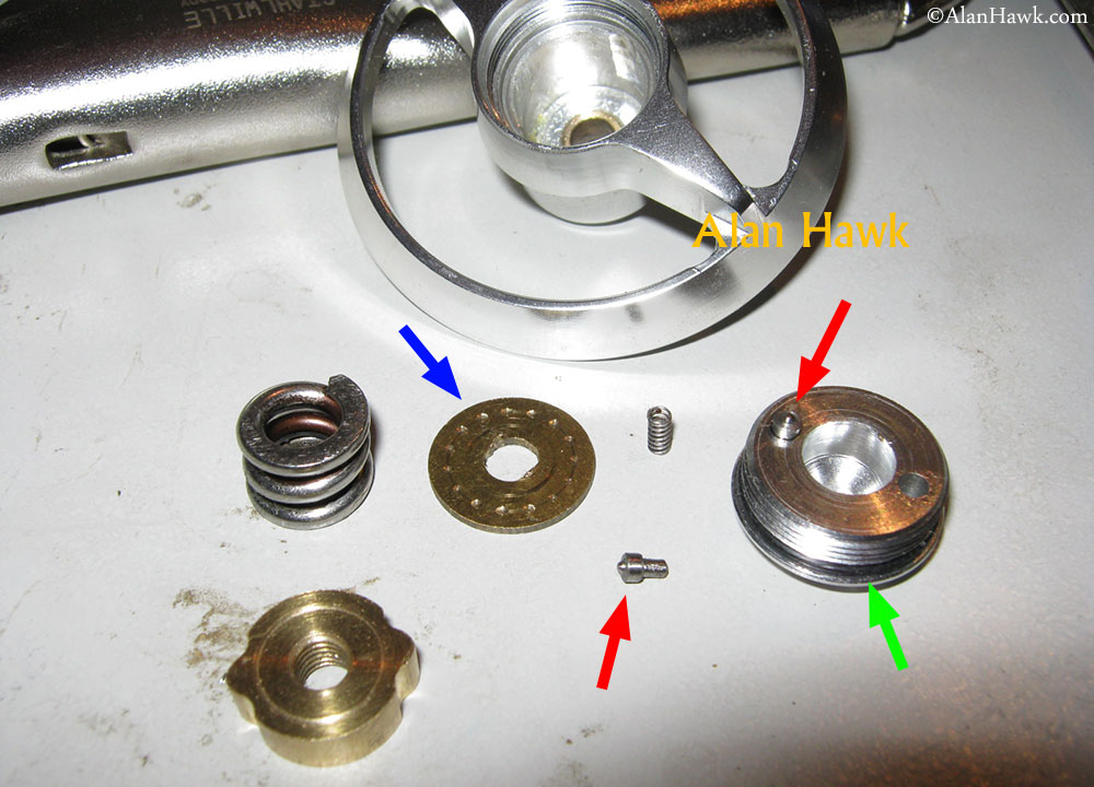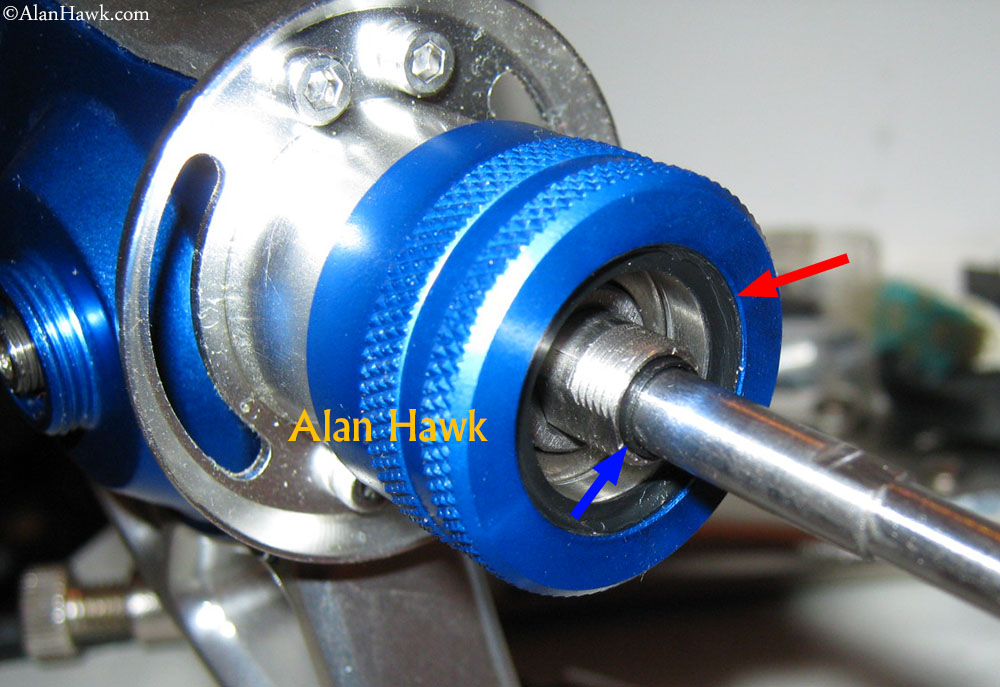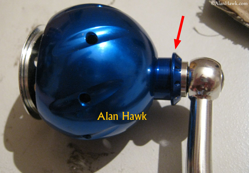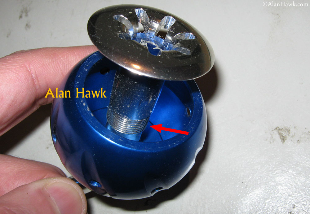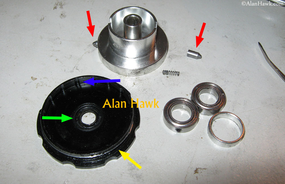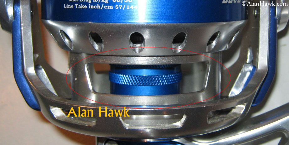 The drag knob has an internal micro clicker (red arrow) that works in conjunction with a brass disc (blue arrow) to produce a clicking sound when you adjust the knob, and more importantly to prevent the knob from turning and changing the drag sitting when the spool spins during a fight. The green arrow points the seal of the drag knob.