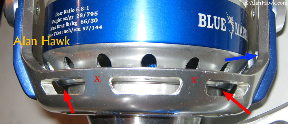 The rest of the rotor is quite original though. The bottom of the spool's skirt (red arrows) sinks a little into the rotor wall, and this raised wall (X) functions as a discreet support beam for the rotor arm (blue arrow). The higher the support beam meets the rotor arm, the better the arm will resist bending moment generated under load. It sounds complex, but trust me, it's a very smart thing to do in a blue water spinning reel. This is the first of several innovative design features in this reel.