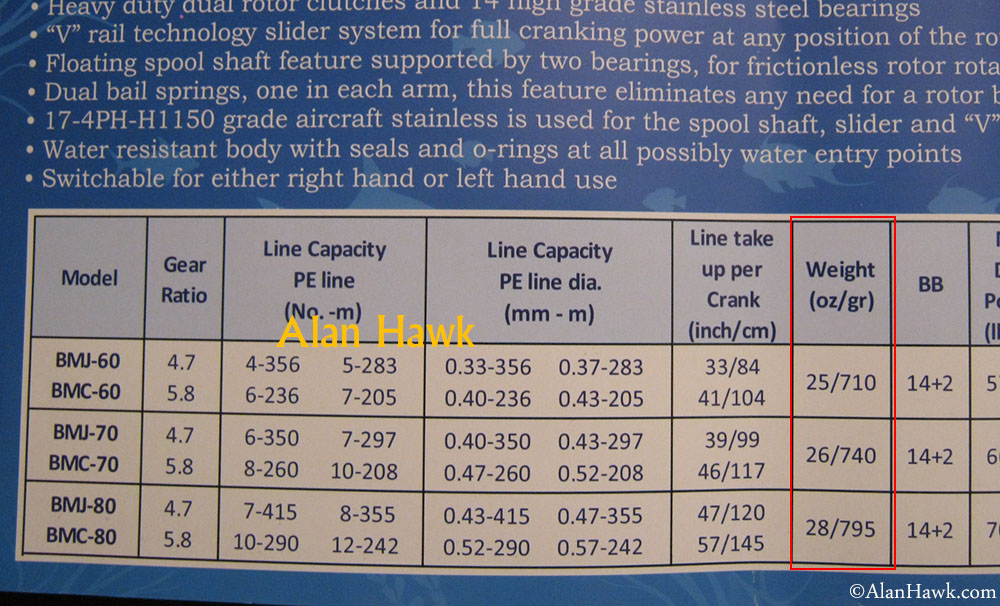 The three sizes of the reel share the same body, with only rotors and spools being different. The BMC models have blue side covers and blue drag knob caps, while the BMJ models have silver ones.