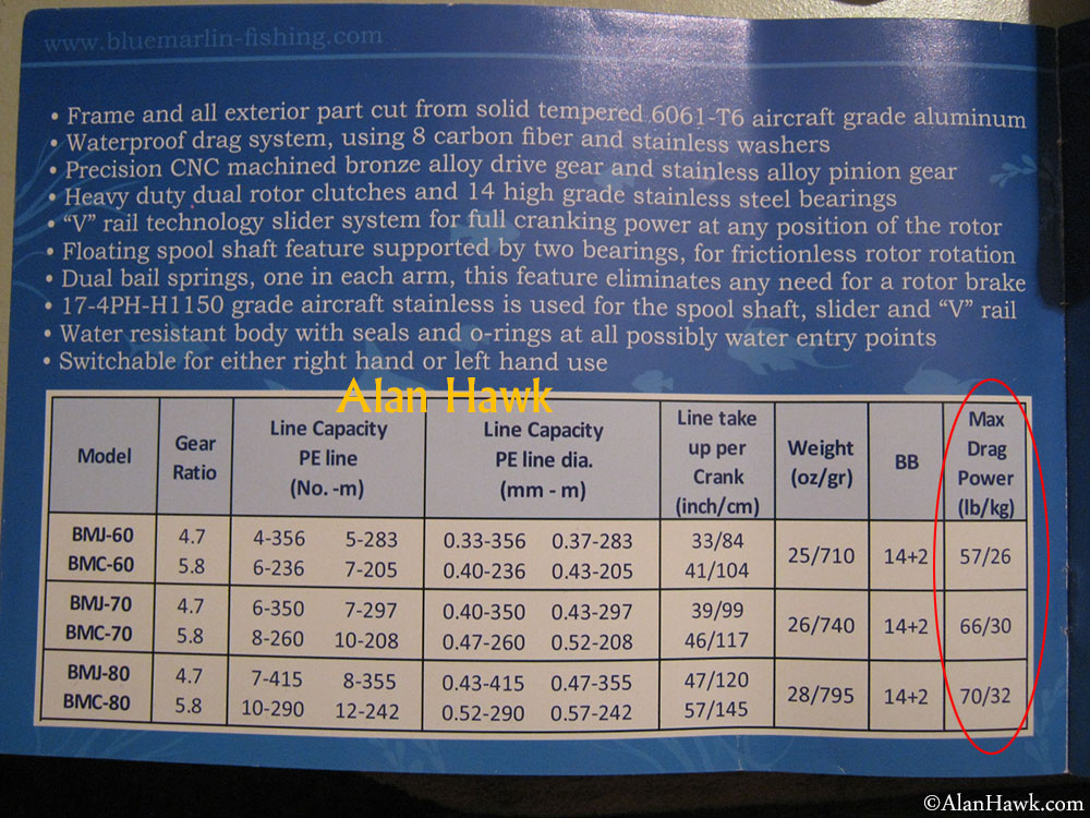 ![]() Still in the manual, the reels come with some serious maximum drag claims. The claimed 32kg (70.5 lbs) of maximum drag for the 80 size is the highest claimed drag of any spinning reel in current production, save a reel called "Lurekiller Saltist" which is a trashy back-alley Chinese reel that's sold under a lie that it's made in Japan, with a claimed 35kg (77 lbs) maximum drag. It's easy for a brake system to produce extremely high pressures, but the real challenge is if the reel as a whole can survive under that high stress and still functions correctly. Anyway, seeing those claims left no doubt in my mind that Blue Marlin company believes that the reel belongs up there in the realm of maximum capability spinning reels, which remains a very exclusive club that many have tried but failed to enter. Will return to the drag later.