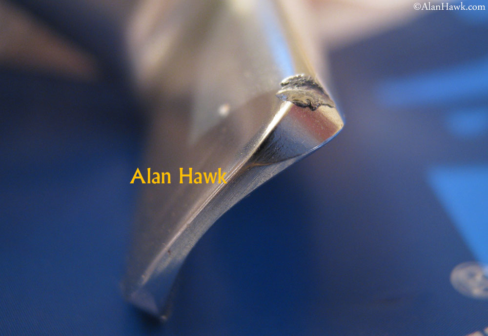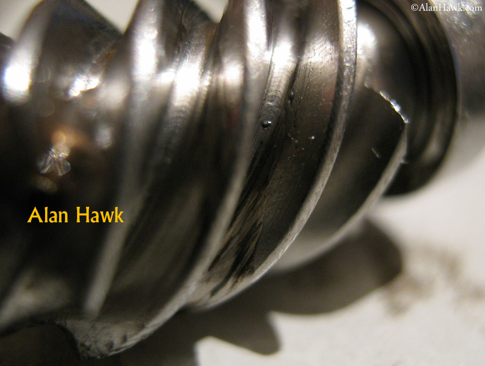 The meshing of the drive gear and pinion is not very accurate as the wear marks on the teeth indicate, with about 50% of the tooth only coming in contact with the pinion and the rest remaining intact. Doesn't hurt much in this reel since the stainless steel alloy used is quite good and the gear is not going to break even if the contact area is less than it is now. Better contact is essential though in gearing systems made of lesser strength alloys to distribute load and reduce stress that can cause fractures.