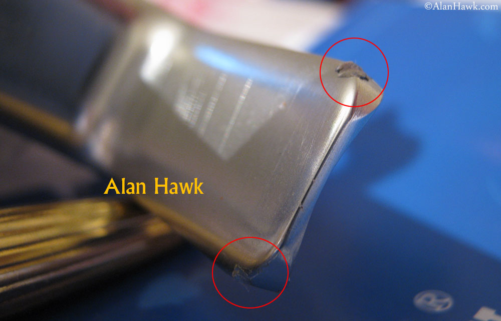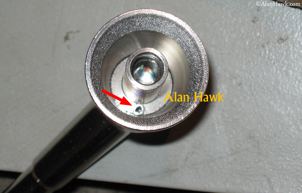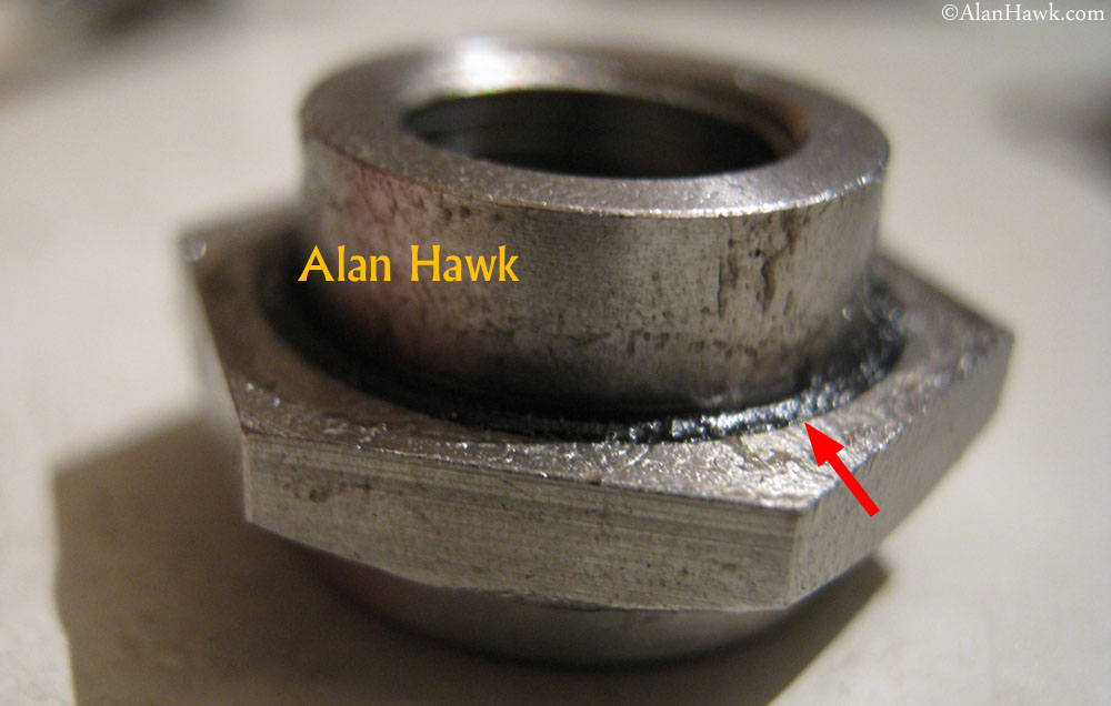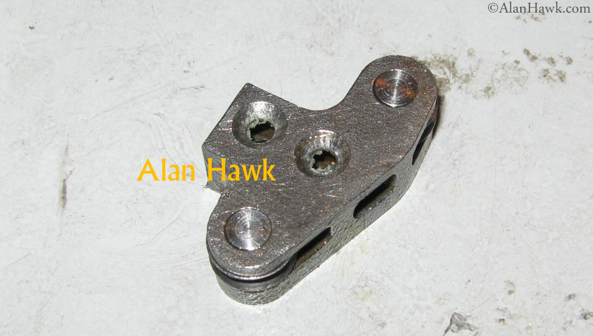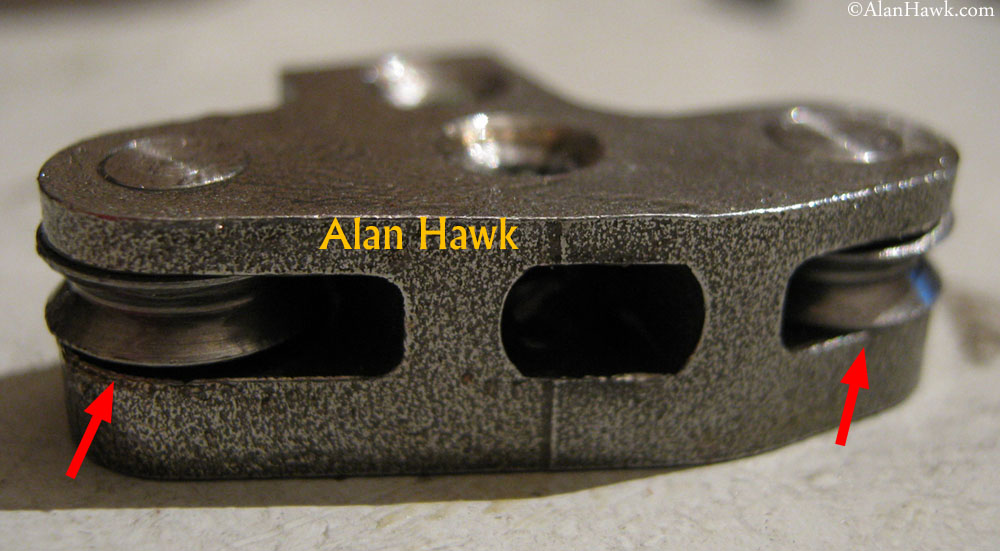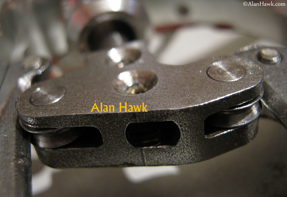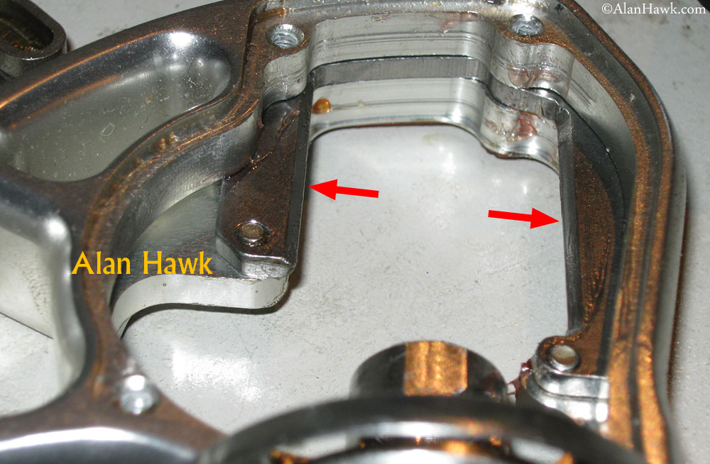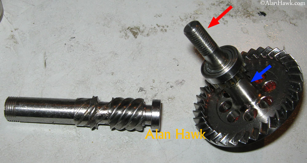 The oscillation gear's retaining screw is not threaded into the aluminium side plate, but rather into a stainless steel fixture (red arrow) inserted into the body.