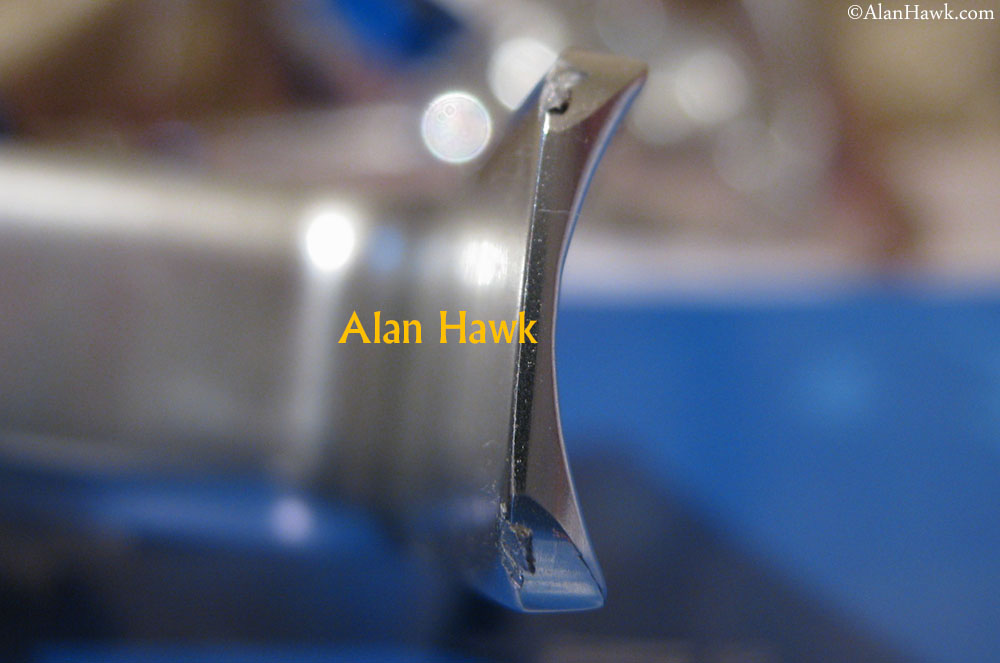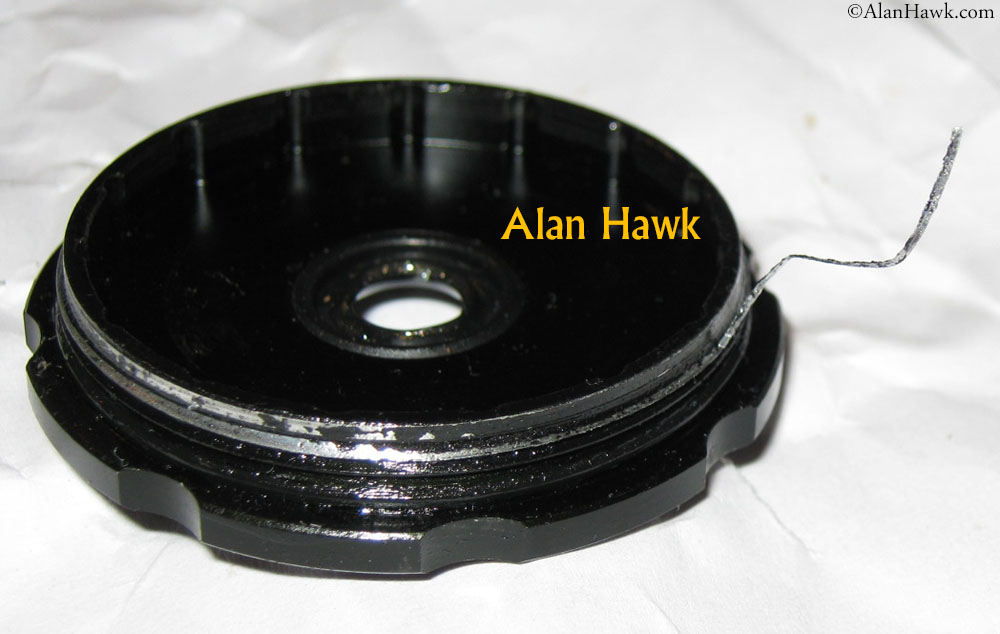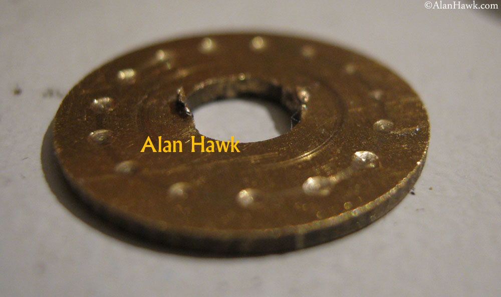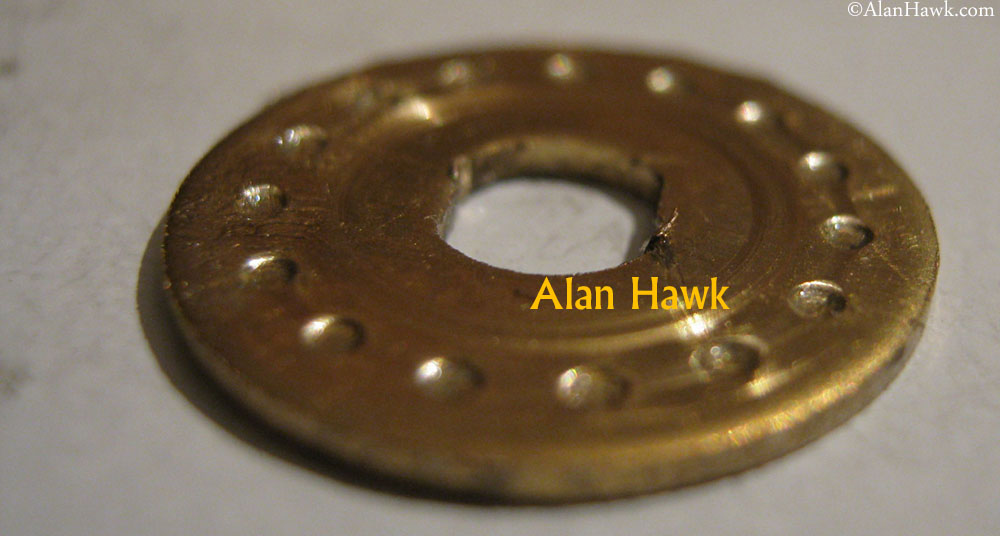 For comparison the disc from the other reel has clearly deeper indentations, and this knob was indeed making proper clicking sound. It's deformed in the centre as well, but to a lesser degree because it wasn't used as much. Again, we see two parts that are supposed to be identical because they are actually the same part, yet one of them is stamped deeper than the other. More problems with quality control and materials. The indentations on all discs need to be of the same proper depth, and a harder brass alloy is needed.