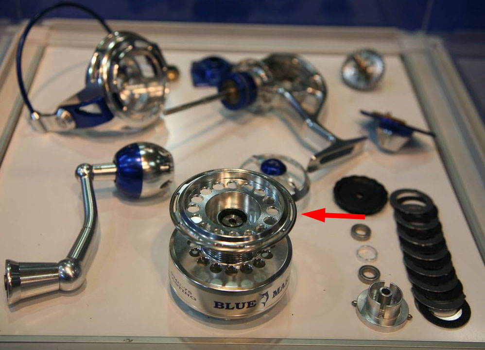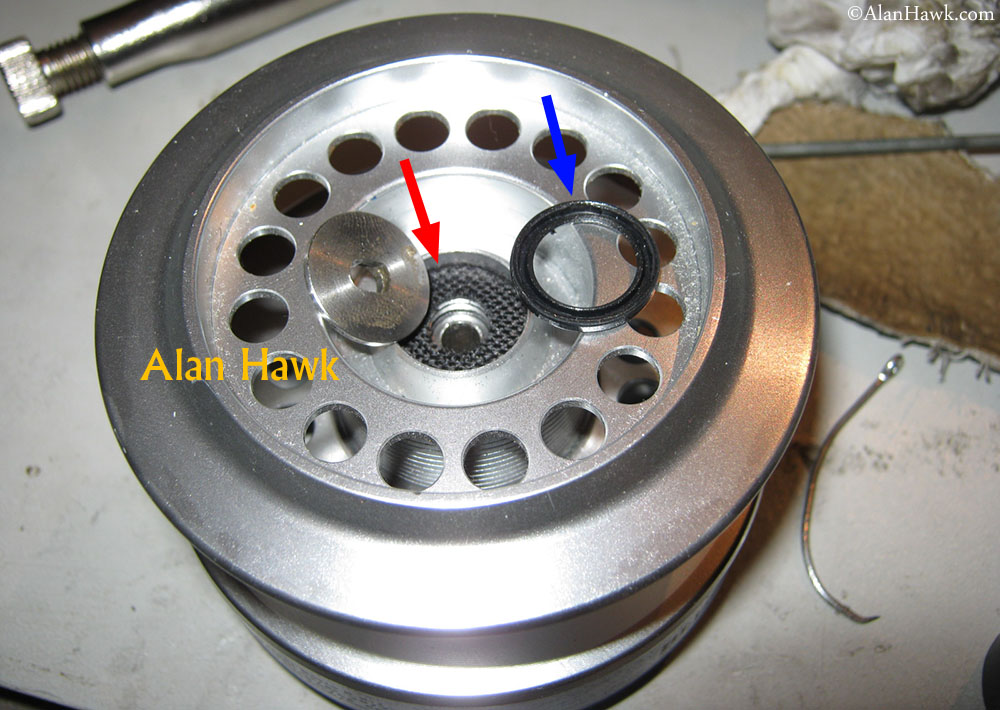 On the top there is a tiny drag washer that functions more as a spacer than a brake disc (red arrow), and the very effective sealing around the drag knob is achieved via another oil seal (blue arrow).