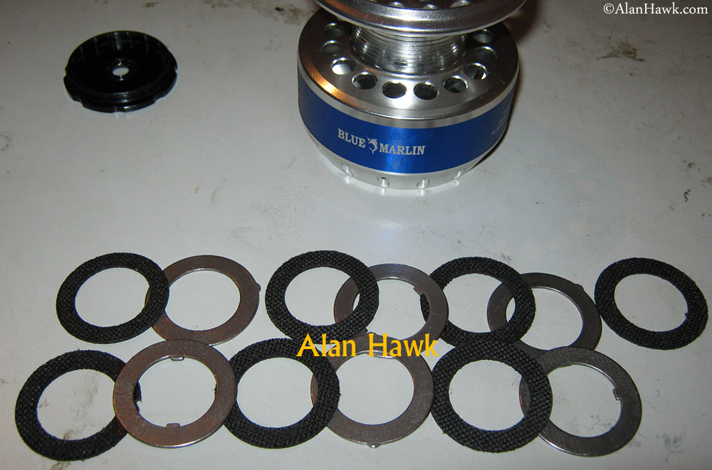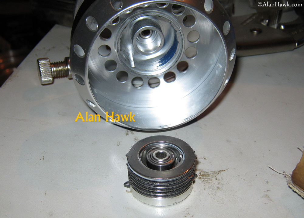 ![]() The drag setup is another novel design. The washers go into the bottom of the spool, but they fit inside the spool's spindle just like in a standard top stack. This is different to the classic bottom drag where one or two large washers apply pressure against the spool's bottom flange. I'd call the drag of the BMC/J a "bottom stack" setup, and this design is found in the Van Staal VR reels as well. While this bottom stack setup has no operational advantage over the top stack, it provides better protection to the drag washers from water intrusion being protected by the spool's skirt in the back.