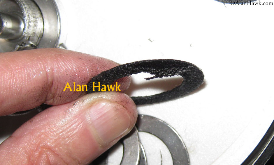 These are the culprits. The drag washers are simply horrible. They aren't a full mesh of fibres, but rather a solid strip in the middle with a thin layer of fabric attached to each side. They don't compress, the surface isn't even, and after a little while they fall apart and the fabric falls off the middle strip as seen in the photos. These horrendously low quality washers don't belong in any serious reel.