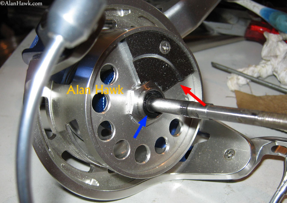 Beneath the spool everything is neatly done. The main shaft is protected by another oil seal (blue arrow), and the counter weight (red arrow) double tasks as a nut retainer. A very important thing to note here is that in the BMC/J reels the bail arm can be attached to either rotor arm, so be careful when you assemble the reel to make sure the bail wire is pointing in the opposite direction to the counter weight. If you reverse it and the wire pointed in the direction of the weight, the balance of the rotor will be thrown off and it will cause wobbling. In other reels the bail arm will only fit in one rotor arm, but here it can fit in either one hence the warning.