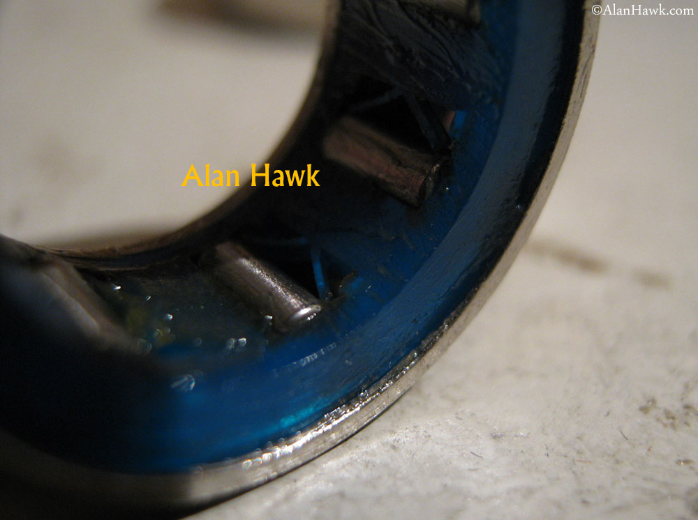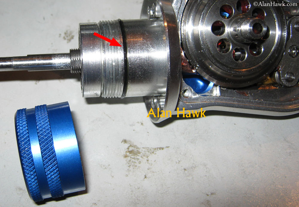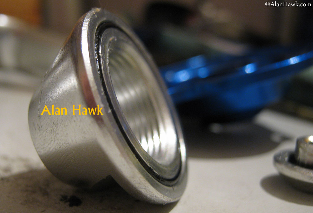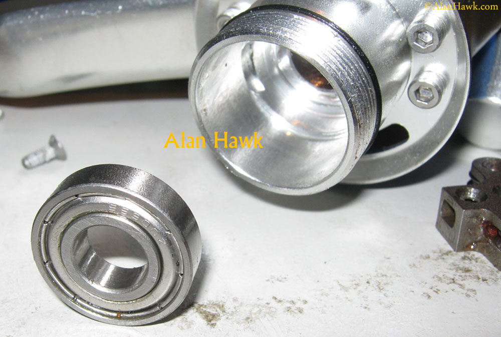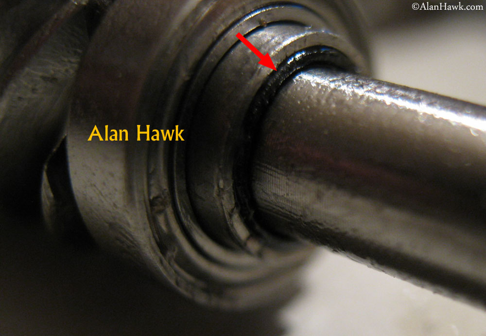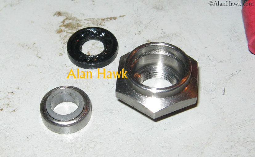A better view of the oil seal of the shaft, and a ball bearing in the nut to insulate the rotation of the rotor from the main shaft. This usually constitutes the first half of the "floating shaft" feature. More about it soon.