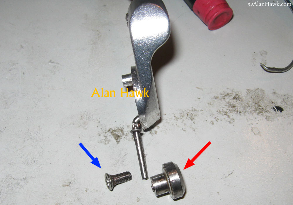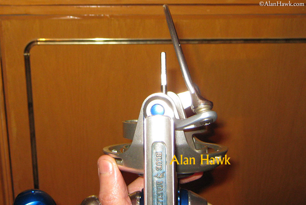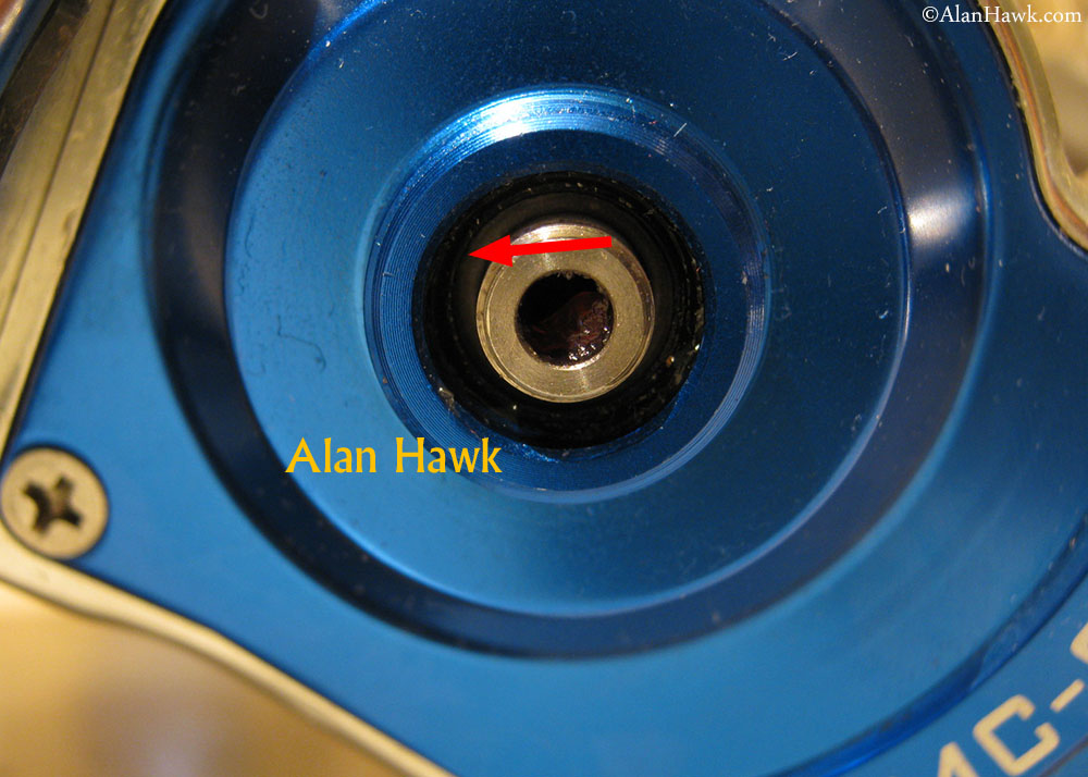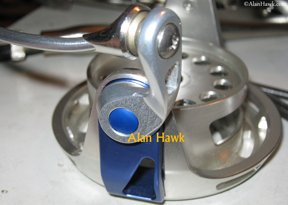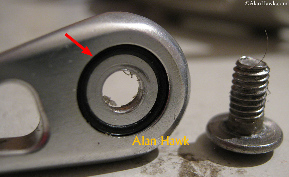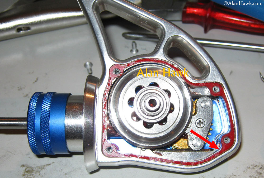 And of course this fixture has an O ring seal for waterproofing (red arrow). Using this stainless steel fixture allows them to keep the side plate thin and light, and if you over-tighten the screw no harm will be done since the screw threads into stainless steel and not into the aluminium frame. The oscillation gear rests on a Teflon washer (blue arrow) for smooth spinning.