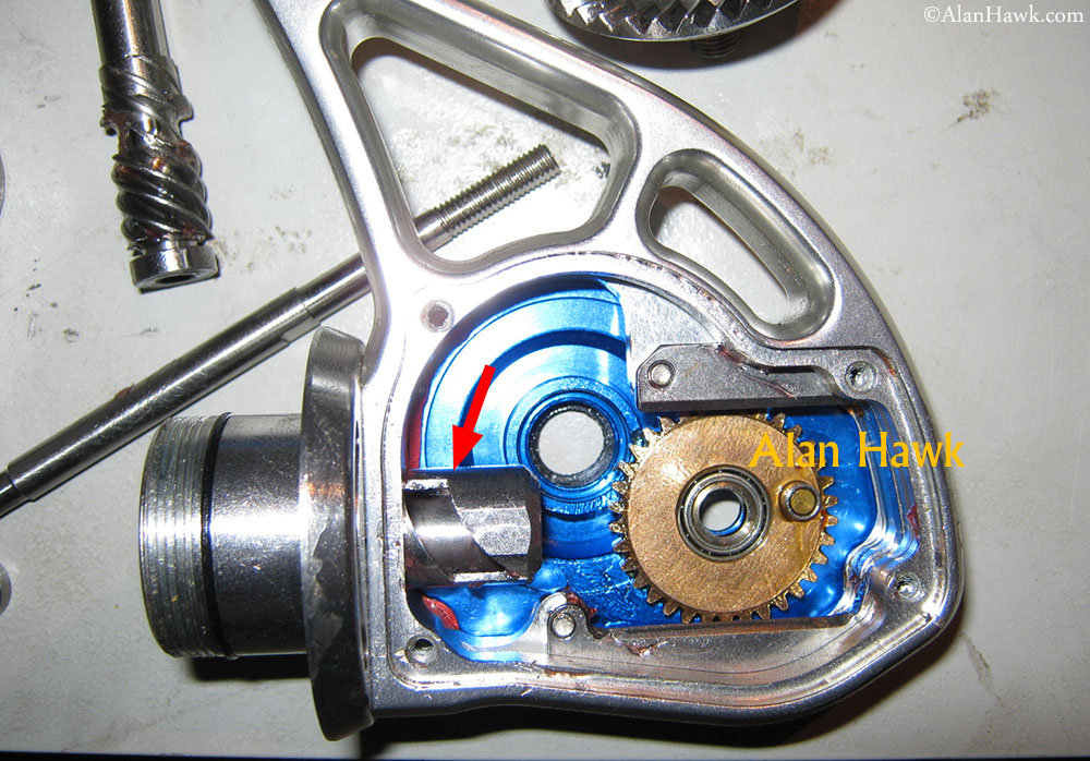 The interesting gearbox design, with the "hatchet" style pinion tube (red arrow). This design allows the insertion of the inner ball bearing of the pinion at the end of the tube, and negates the need for a centre post in the body. In this photo you can see the thick walls of the body, which is machined from a rigid 6061 aluminium alloy.
