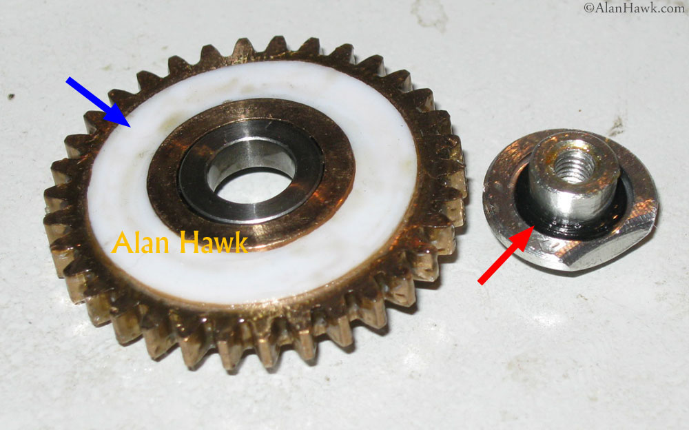The oscillation gear is machined brass, spins on a ball bearing, and has a stainless steel sleeve (red arrow) to reduce wear and friction with the oscillation block.