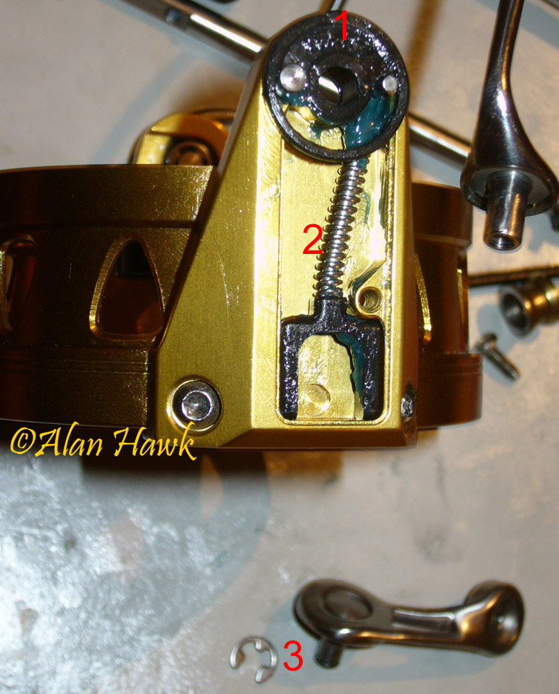 Still in the above photo, #2 is a PTFE washer underneath the gear for smoother running, and #3 is the machined frame of the reel. Needless to say that a body machined from an aluminium billet creates a high strength part that is lighter than an equally strong part made by moulding.